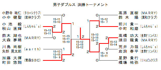 | MD-5 | しんちゃんWs | 前川 貴一・中町 和磨 | 2 | 15-12 15- 7 | 0 | 高原 直樹・鈴木 陽 | MARRY・東和C. | |