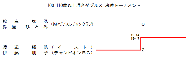 | 100.110XD-1 | イースト・チャンピオンBC | 渡辺 勝浩・伊藤 朋子 | 2 | 15-14 15- 7 | 0 | 鈴鹿 智弘・鈴鹿 ひとみ | あいづアスレチックC. | |